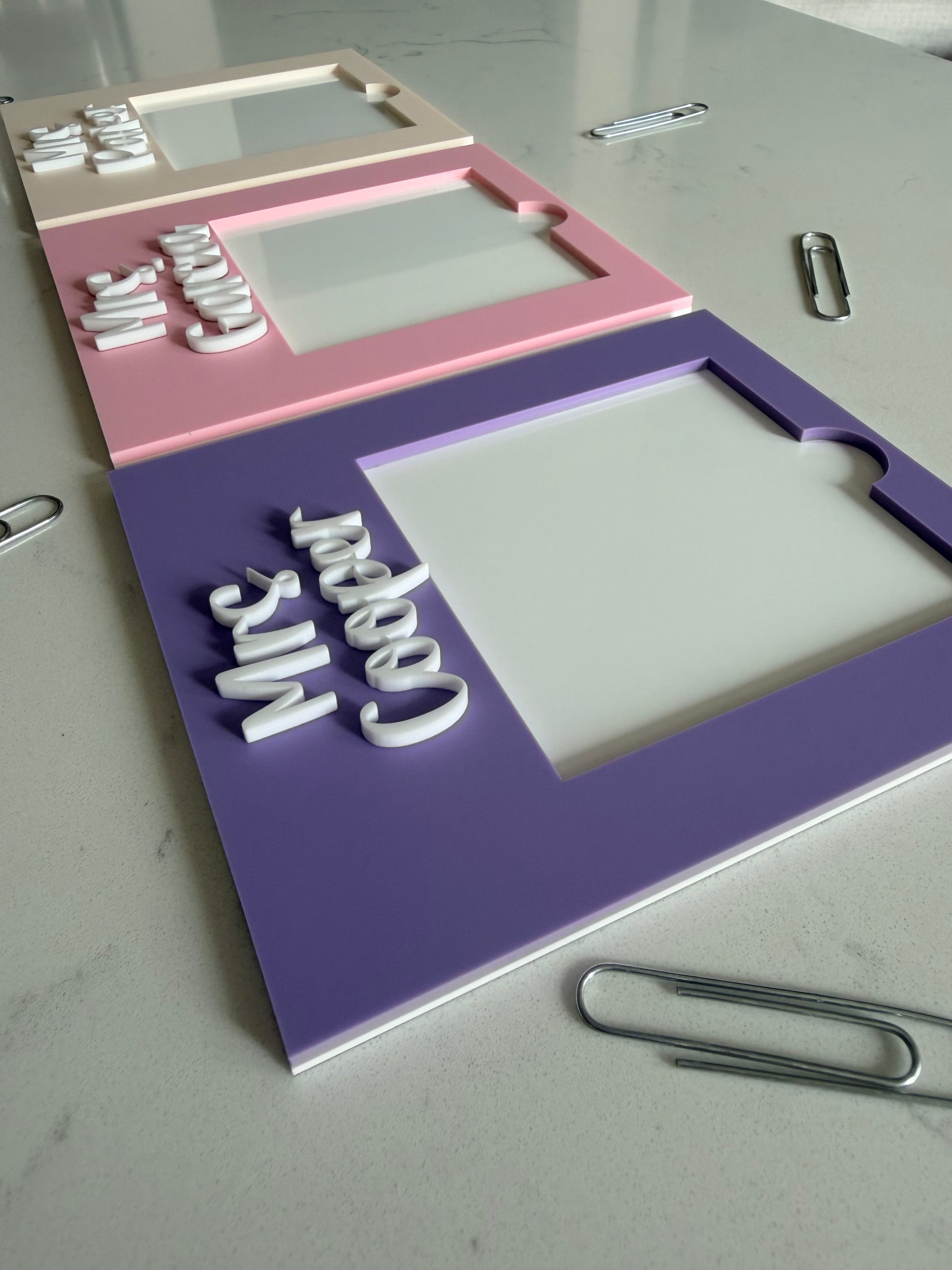 Brighten any desk with a personalized Post‑It Note Holder designed to be both functional and beautiful. Each holder is crafted with two layers of premium acrylic: a crisp white backer for structure and a customizable top layer in the color of your choice. The teacher’s name is cut from a separate acrylic color, giving the design depth, dimension, and a boutique‑quality finish.